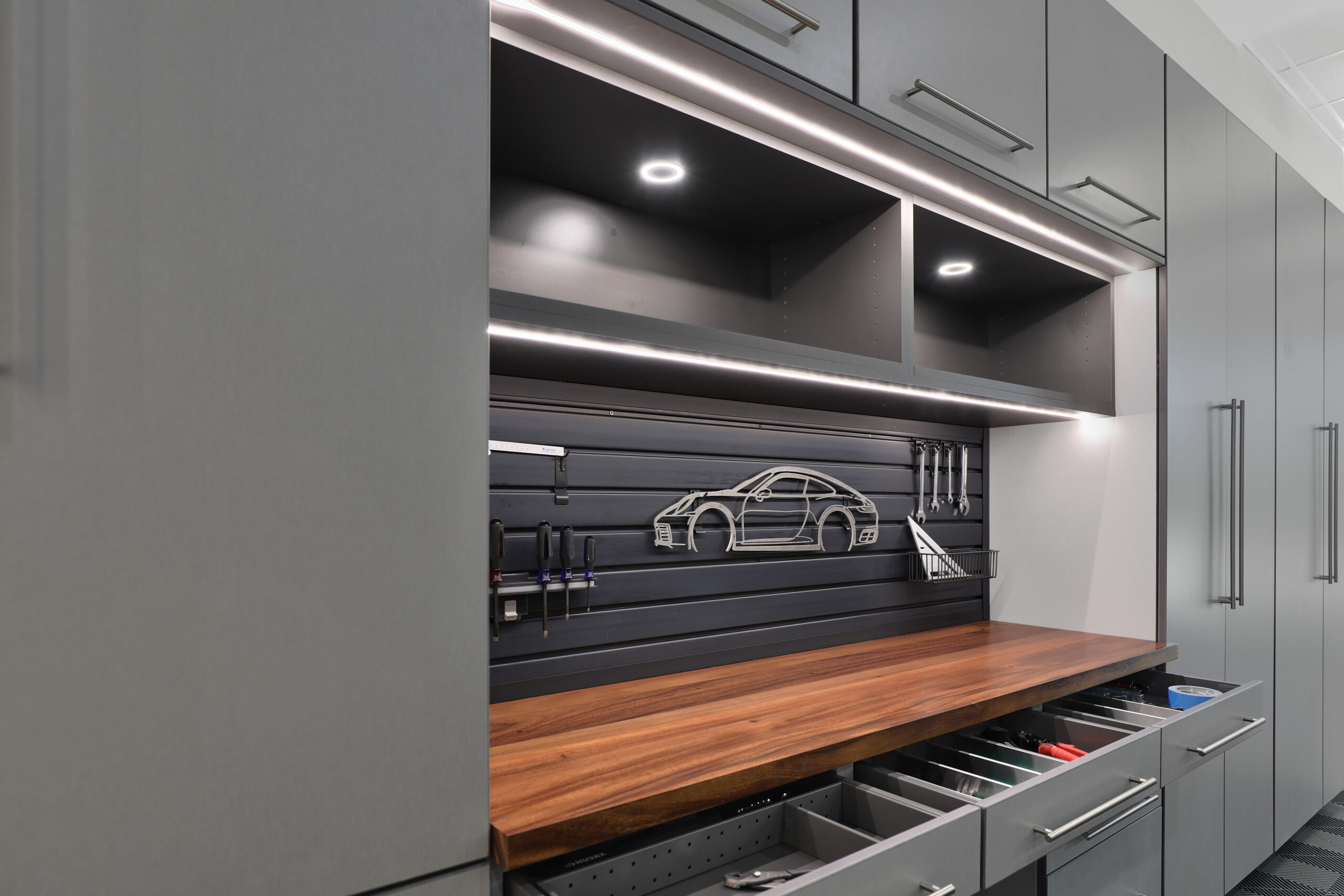 We offer custom configurations of workbenches made of durable materials for every need in every garage. Workstations that will ensure easy access to all of your key needs. After all – it is your garage! It will get used!