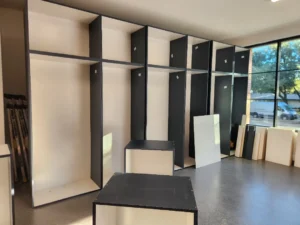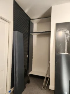 A job this complex doesn’t go perfectly linear. During installation, we identified a missing pencil drawer face and drawer glides that required sourcing before the workbench section could be completed. A return trip was made to bring in those components — along with three additional boxes of Graphite Slatwall to complete the coverage.