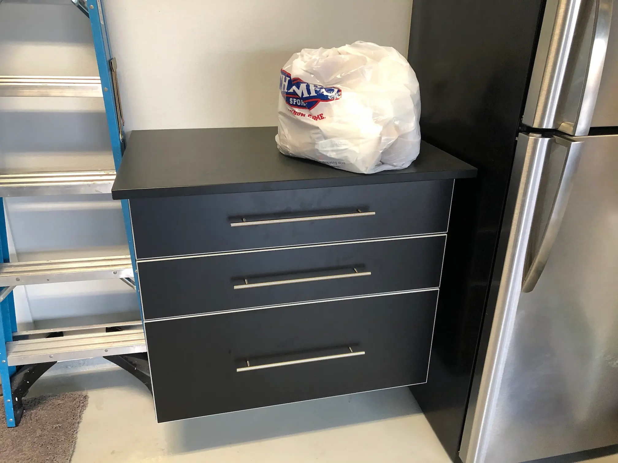 One 24″ wide cabinet got an upgrade most people don’t think to ask for: slat wall installed on the interior back wall. It’s a small detail that turns dead cabinet space into active organization — hooks, small bins, and accessories can live inside the cabinet itself rather than taking up shelf space.
