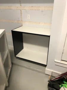One 24″ wide cabinet got an upgrade most people don’t think to ask for: slat wall installed on the interior back wall. It’s a small detail that turns dead cabinet space into active organization — hooks, small bins, and accessories can live inside the cabinet itself rather than taking up shelf space.