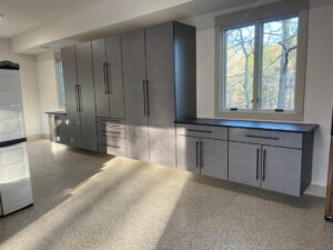 The main garage bay is the one that tends to stop people mid-sentence when they see the photos. Pewter towers rising to the ceiling on either side of the windows. Long base cabinet runs with Graphite Black tops. A slatwall system that holds everything from extension cords to garden tools without looking cluttered. An epoxy floor that reflects the overhead light. It’s a garage that looks like it was designed — because it was.