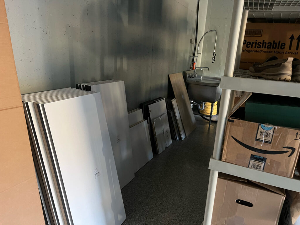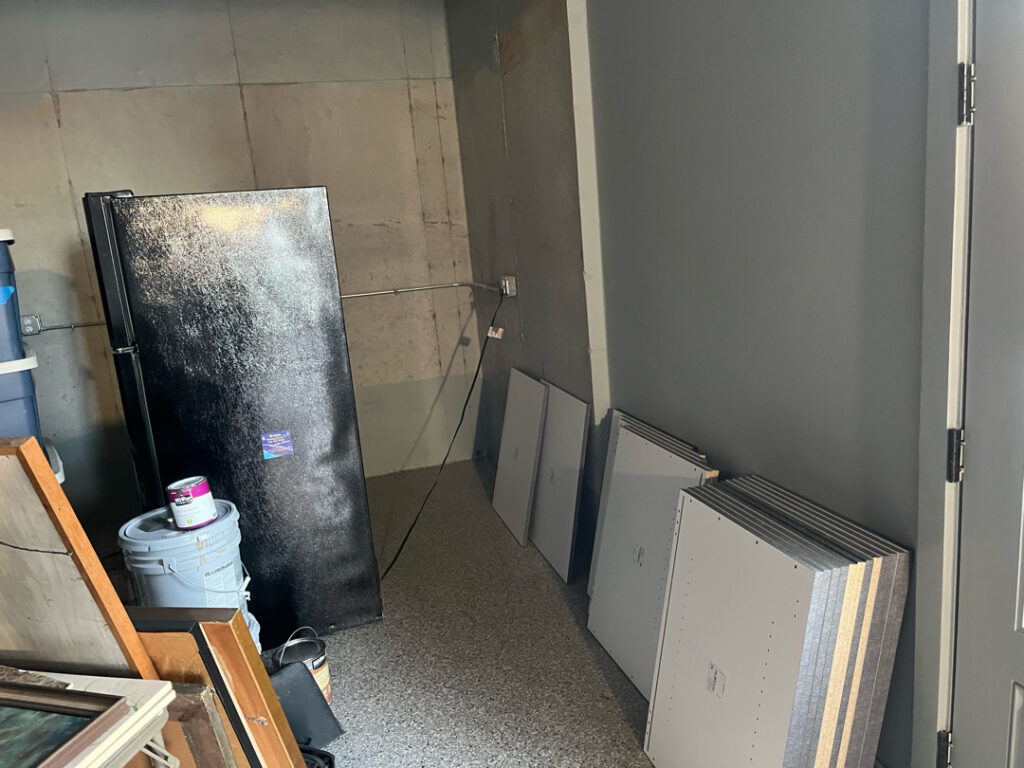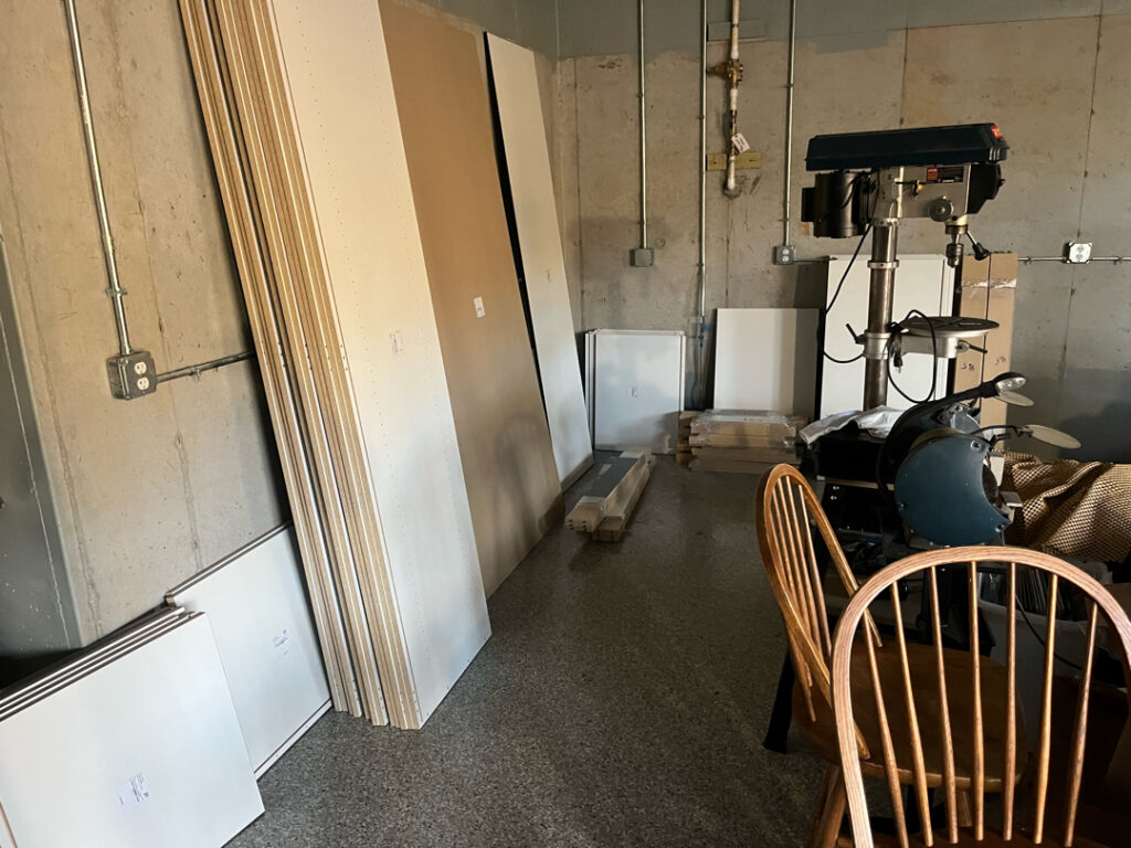 The storage room had a different set of demands. A utility sink. Exposed concrete walls. A grounding rod that couldn’t be moved. And a homeowner who needed space for kayaks, power tools, seasonal storage, and a real work surface.